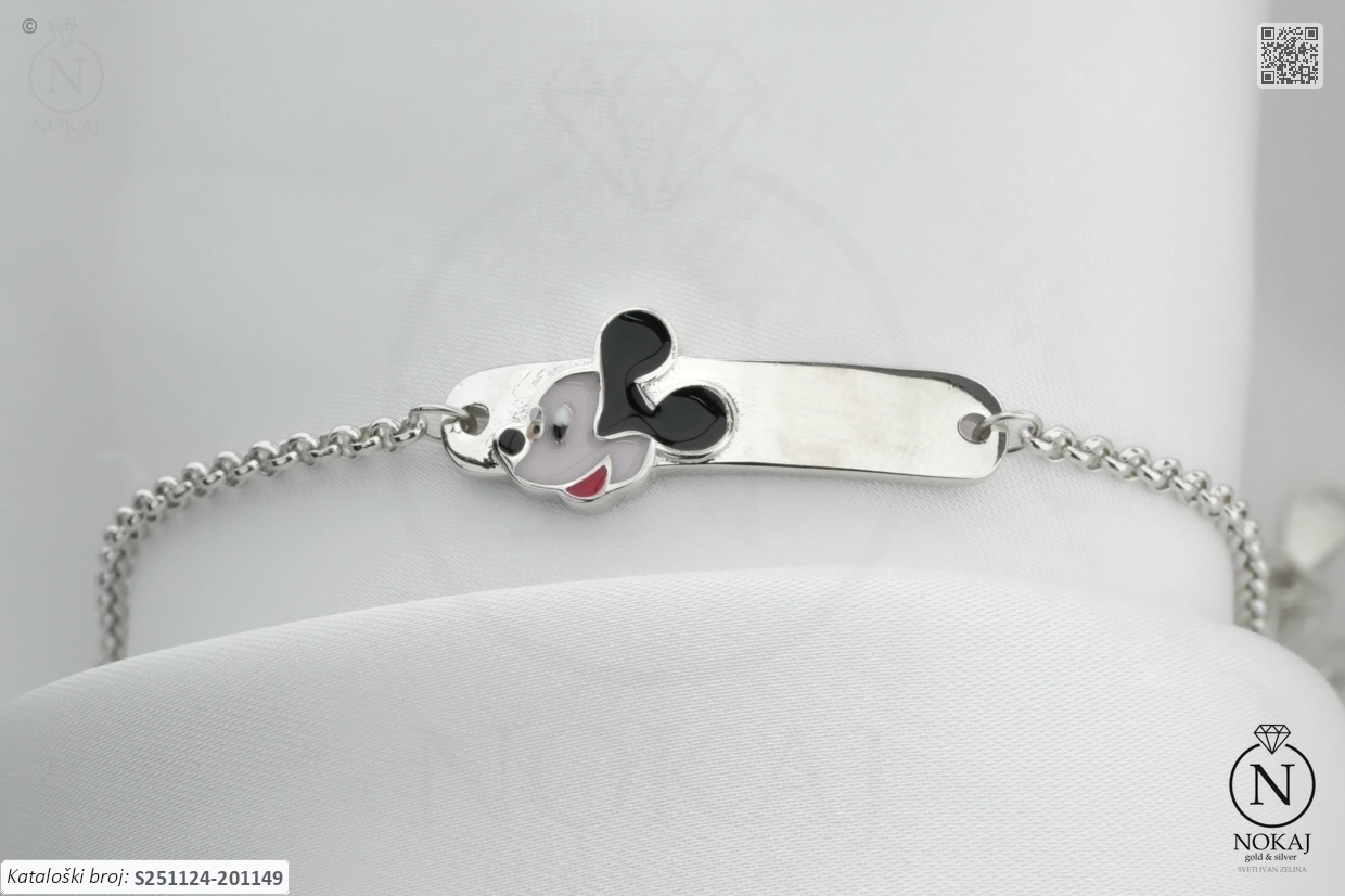 Dječji nakit – mekan, lagan i siguran — prilagođen najmlađima: srebrna dječja narukvica čistoće 925/1000 s motivom stiliziranog crtićnog obilježja.
