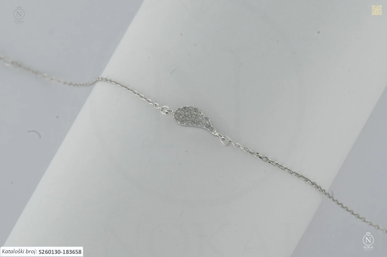 Srebrna narukvica finoće 925/1000, ukrašena cirkonima s motivom anđeoskih krila – predstavlja slobodu i duhovnu zaštitu..
