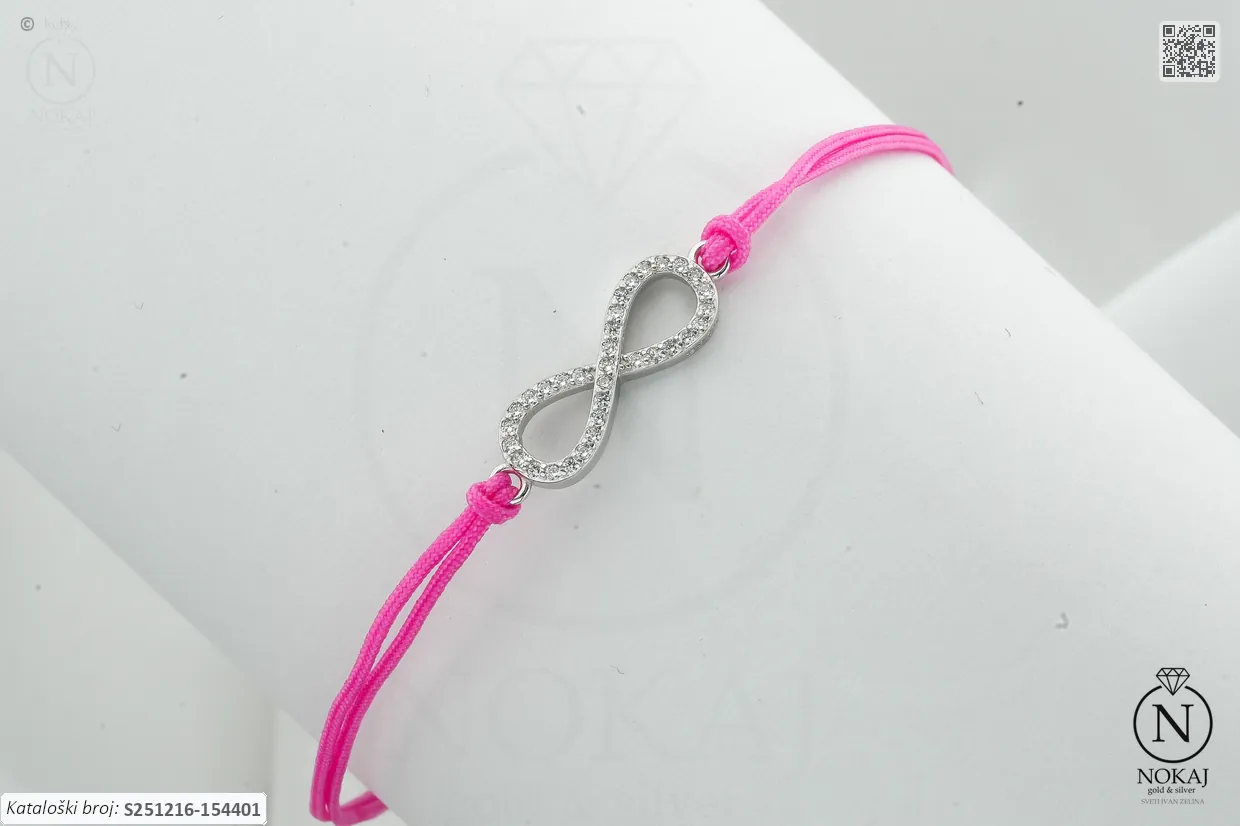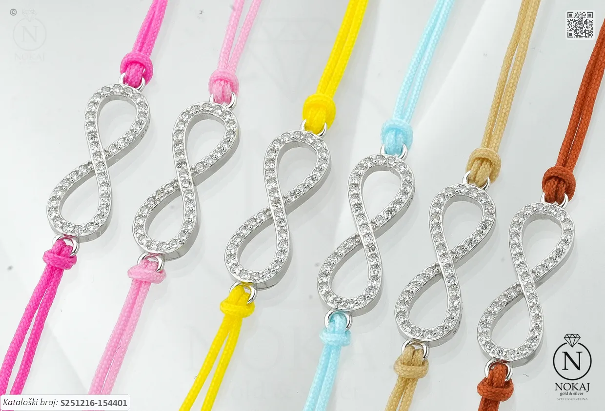 Srebrna narukvica finoće 925/1000, ukrašena cirkonima s motivom beskonačnosti.