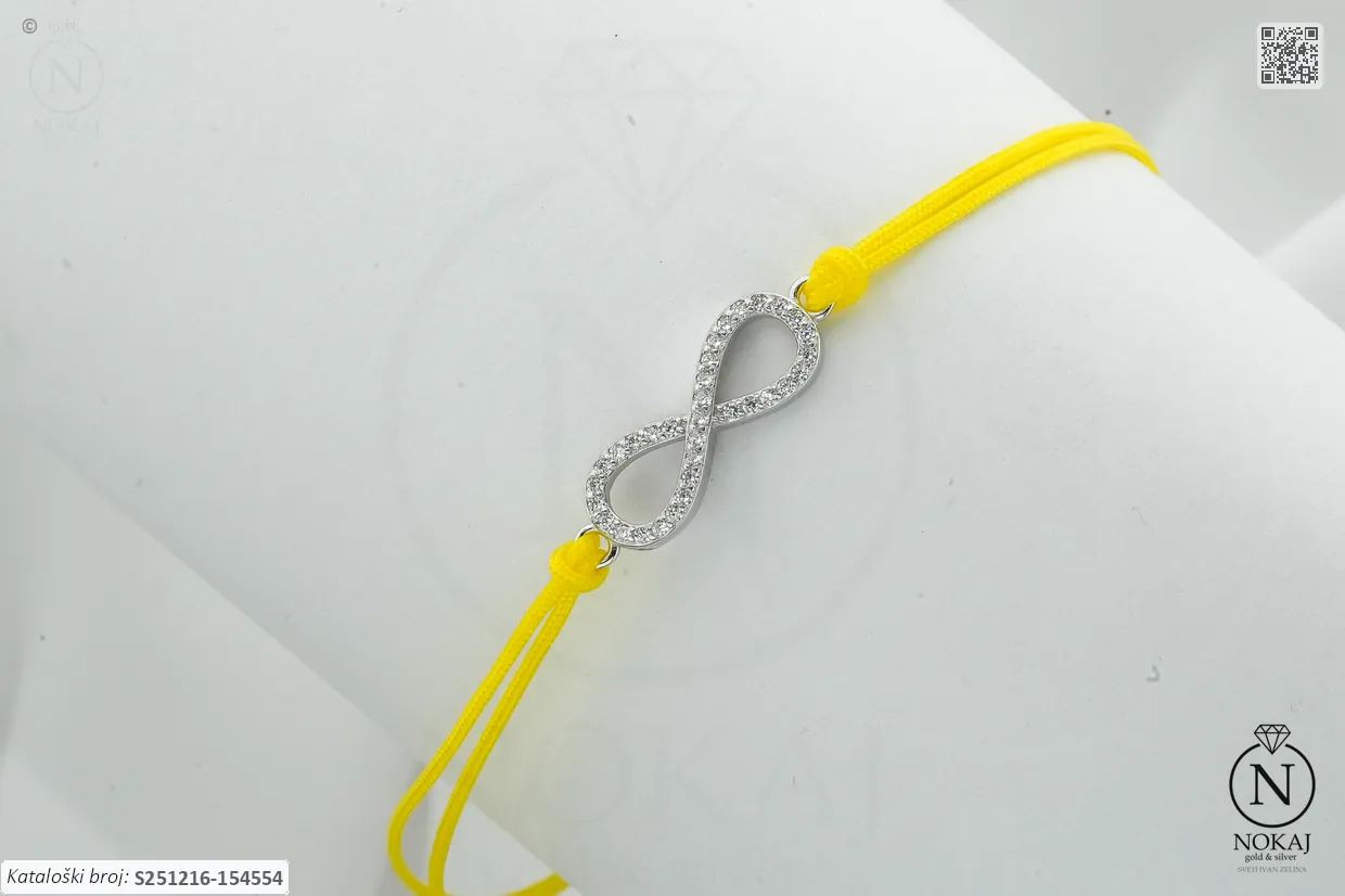 Srebrna narukvica čistoće 925/1000, ukrašena cirkonima s motivom beskonačnosti.
