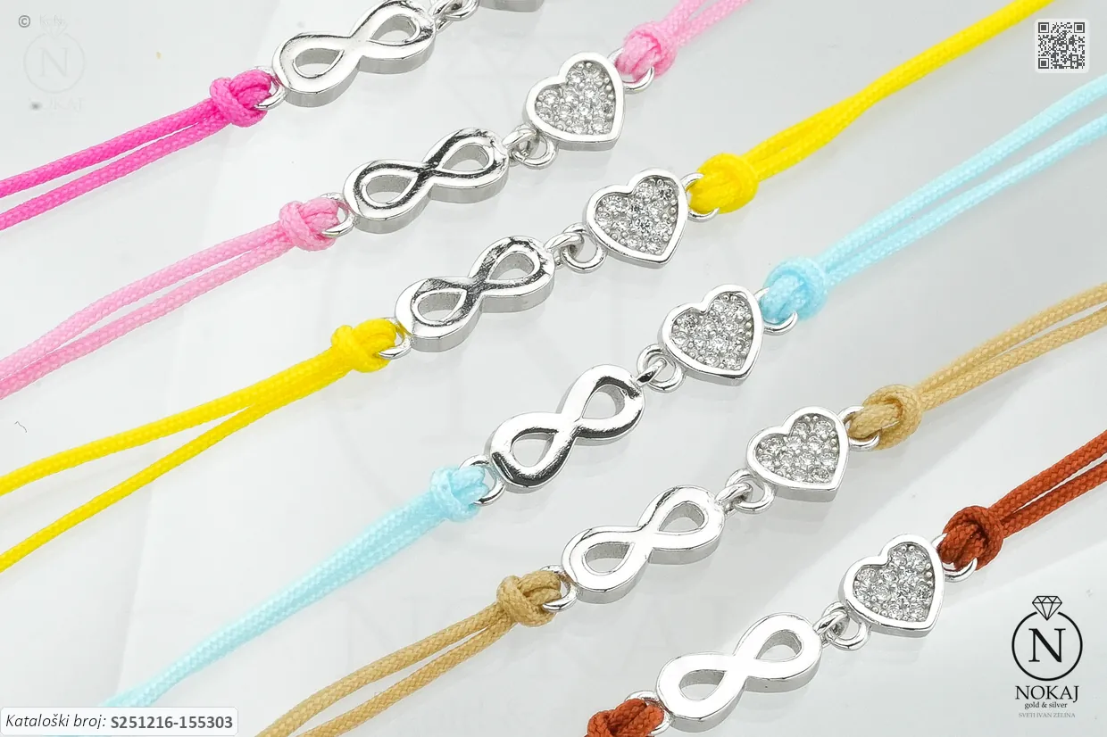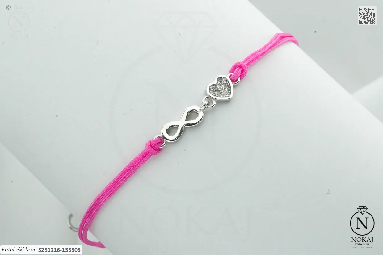 Srebrna narukvica finoće 925/1000, ukrašena cirkonima s motivima beskonačnosti i srca.