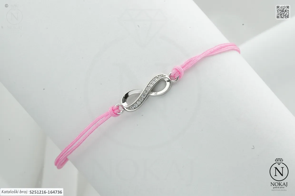 Srebrna narukvica prepoznatljive finoće 925/1000, ukrašena cirkonima Motiv: Beskonačnost. Simbol vječne povezanosti i neprekidne ljubavi..