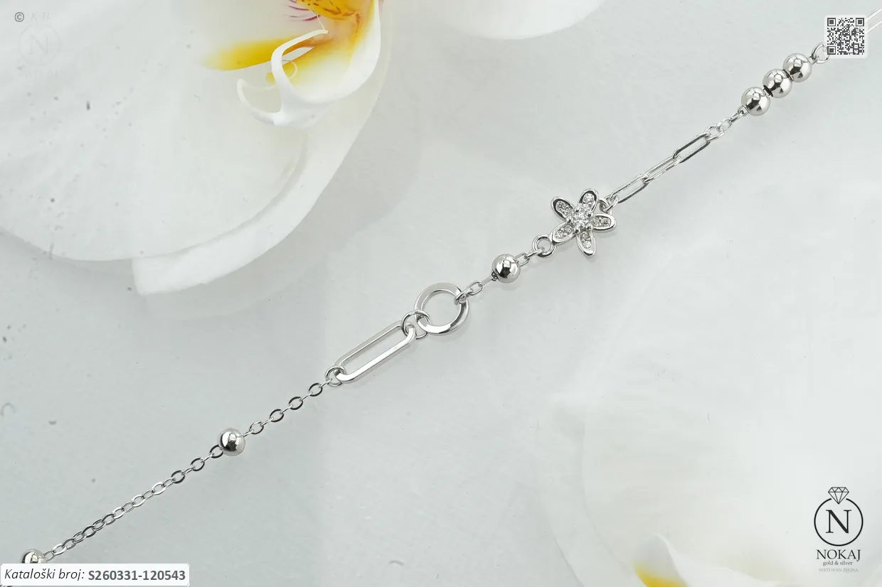 Srebrna narukvica finoće 925/1000, ukrašena cirkonima s motivom cvijeća.