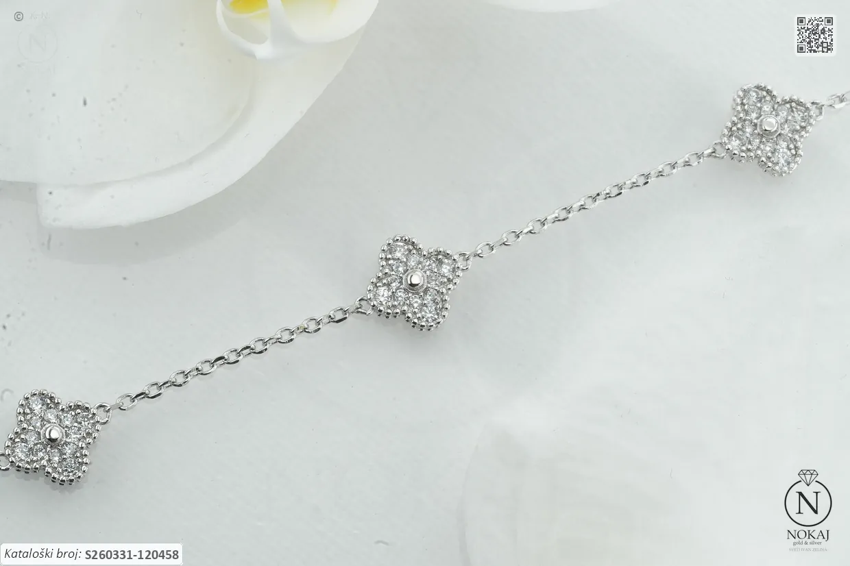 Srebrna narukvica čistoće 925/1000, ukrašena cirkonima s motivom djeteline.