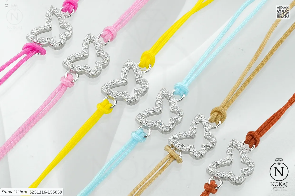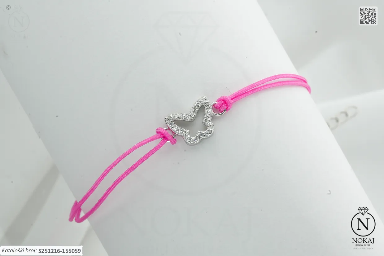 Srebrna narukvica prepoznatljive finoće 925/1000, ukrašena cirkonima s motivom leptira.