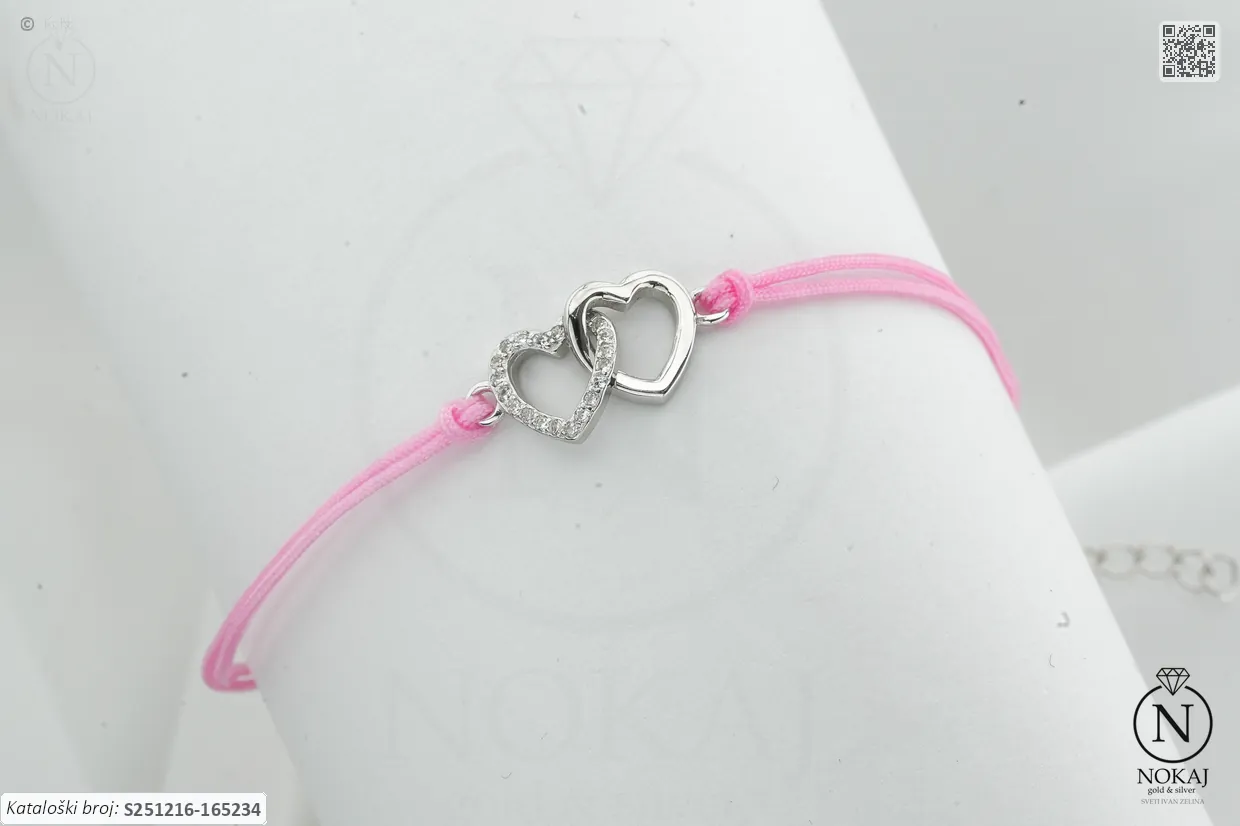 Srebrna narukvica finoće 925/1000, ukrašena cirkonima s motivom dva srca – simbol duboke povezanosti i zajedništva..