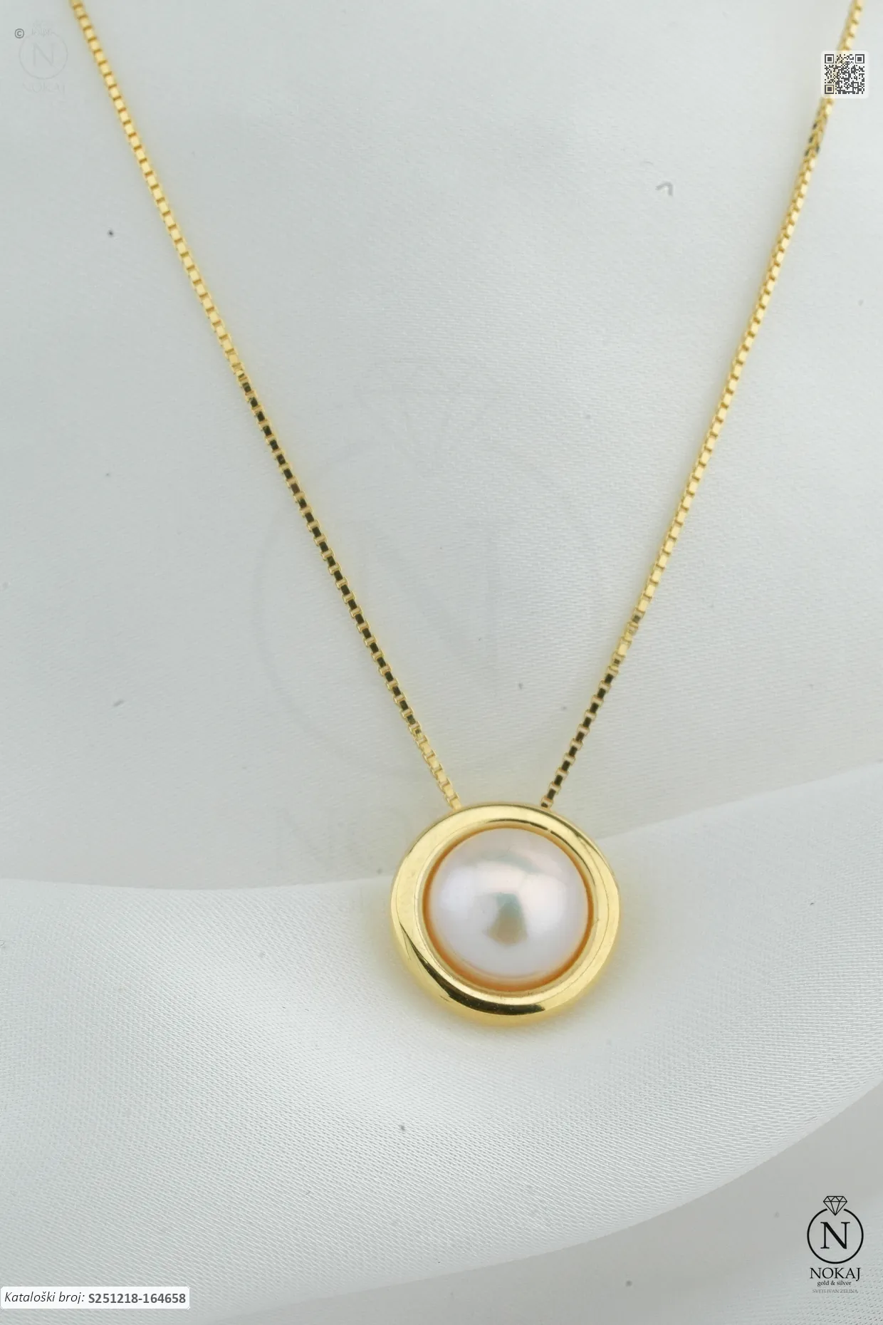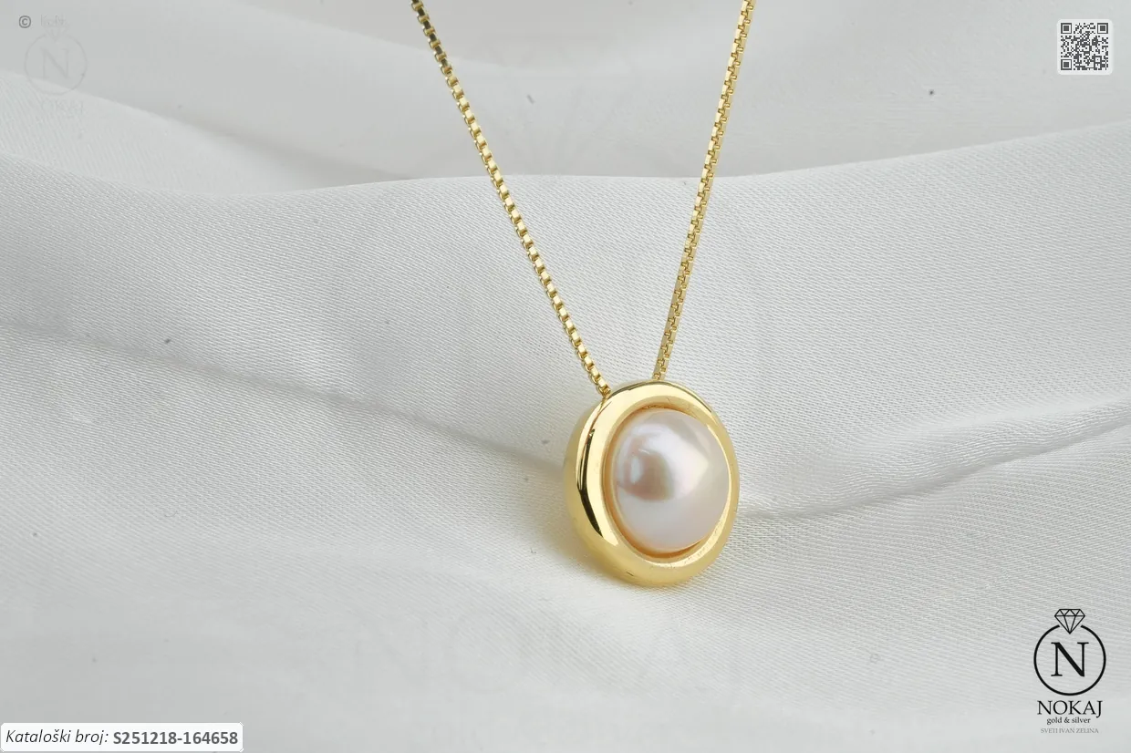Srebrna ogrlica finoće 925/1000, pozlaćen slojem 18k žutog zlata, ukrašen kremastim biserom.