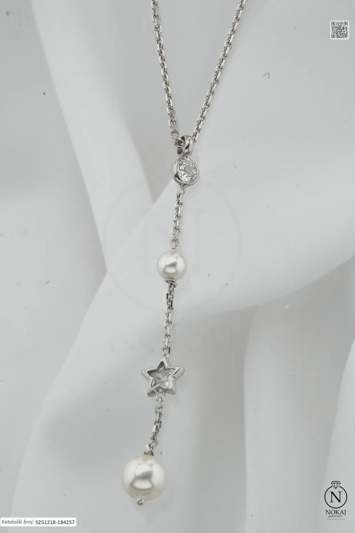 Srebrna ogrlica prepoznatljive finoće 925/1000, ukrašen cirkonima i biserom s motivom zvijezda – simbol svjetlosti koja vodi kroz tamu i pokazuje ispravan put..