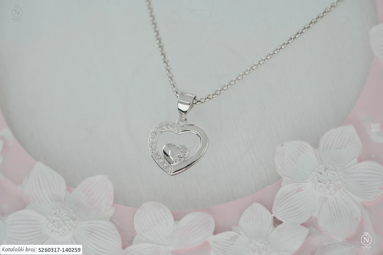 Srebrna ogrlica čistoće 925/1000, ukrašena cirkonima s motivom srce – simbol ljubavi i topline, savršen za izražavanje osjećaja..