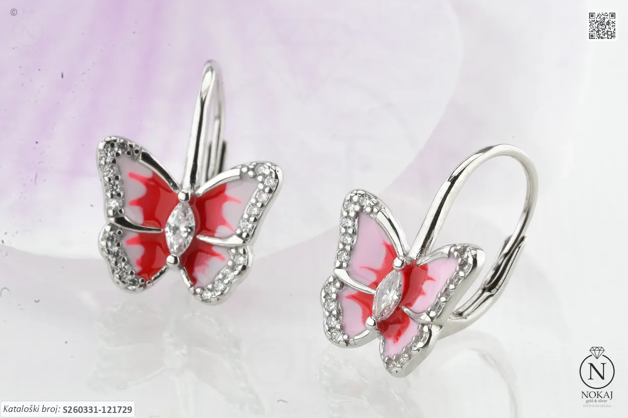 Srebrne naušnice prepoznatljive finoće 925/1000 s motivom leptira.