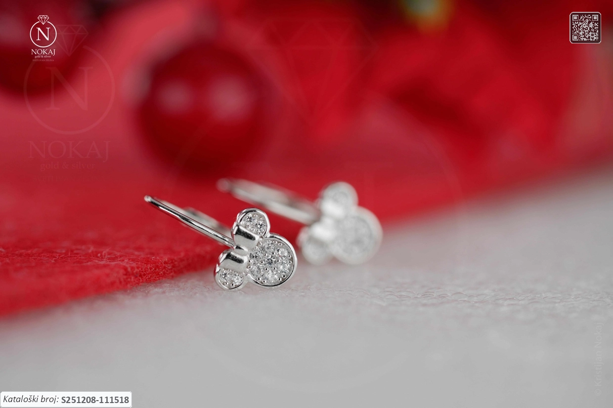 Dječji nakit – dizajniran s posebnom pažnjom na sigurnost i udobnost.: srebrne dječje naušnice čistoće 925/1000, ukrašene cirkonima s motivom stiliziranog crtićnog obilježja.