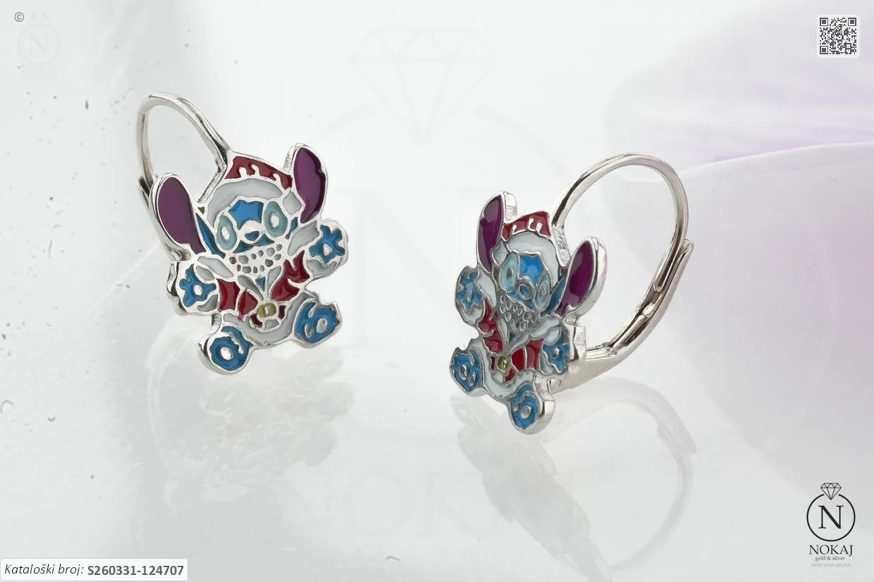 Dječji nakit – dizajniran s posebnom pažnjom na sigurnost i udobnost.: srebrne dječje naušnice prepoznatljive finoće 925/1000 s motivom stiliziranog crtićnog obilježja.