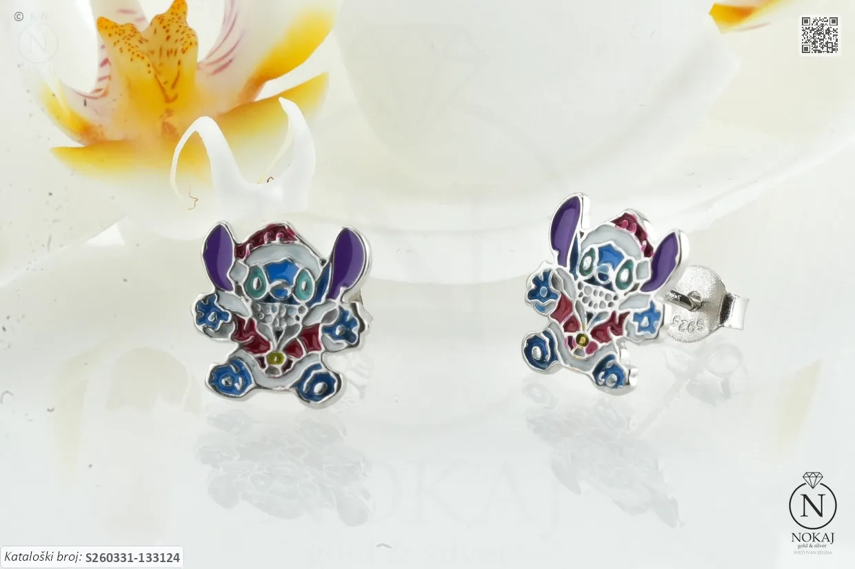 Dječji nakit – dizajniran s posebnom pažnjom na sigurnost i udobnost.: srebrne dječje naušnice finoće 925/1000 s motivom stiliziranog crtićnog obilježja.