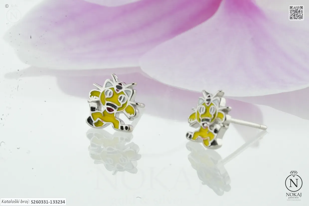 Dječji nakit – siguran i nježan dizajn savršen za najmlađe.: srebrne dječje naušnice čistoće 925/1000 s motivom stiliziranog crtićnog obilježja.