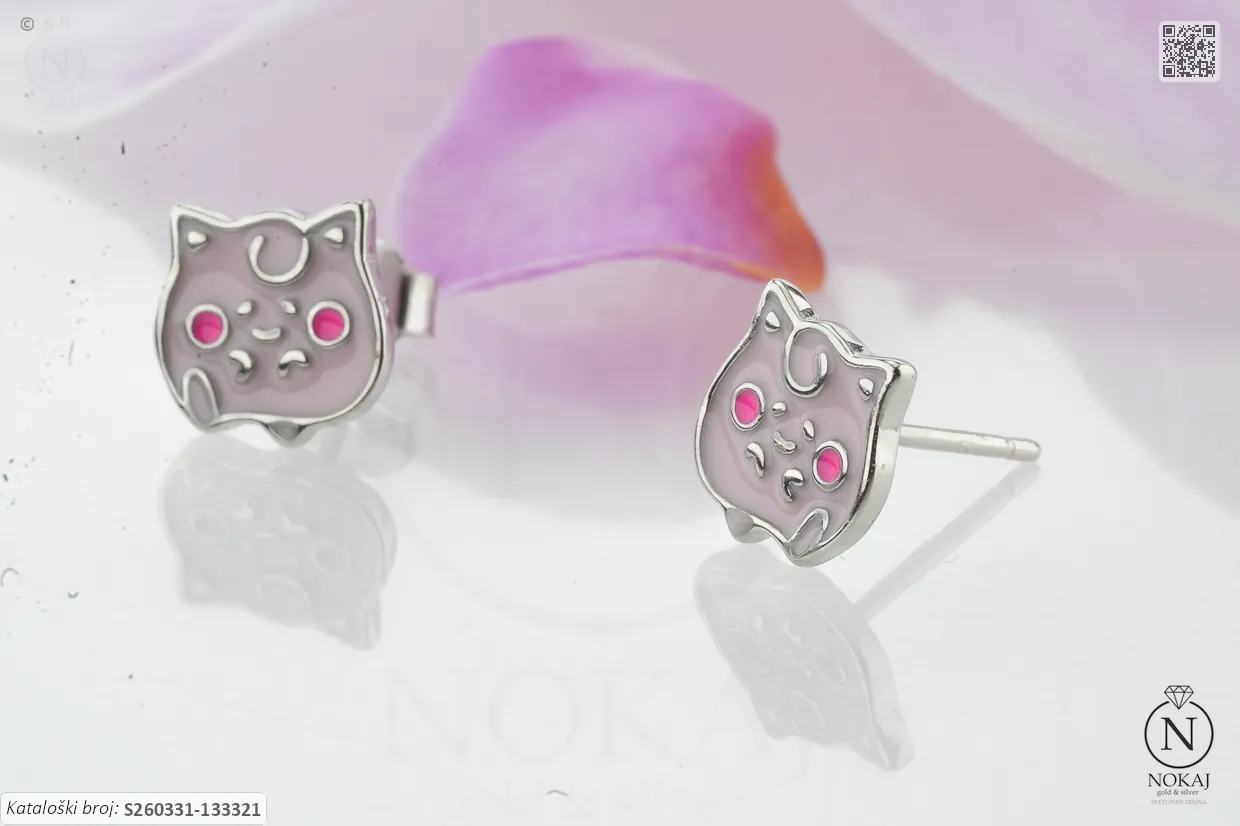 Dječji nakit – siguran i nježan dizajn savršen za najmlađe.: srebrne dječje naušnice prepoznatljive finoće 925/1000 s motivom stiliziranog crtićnog obilježja.