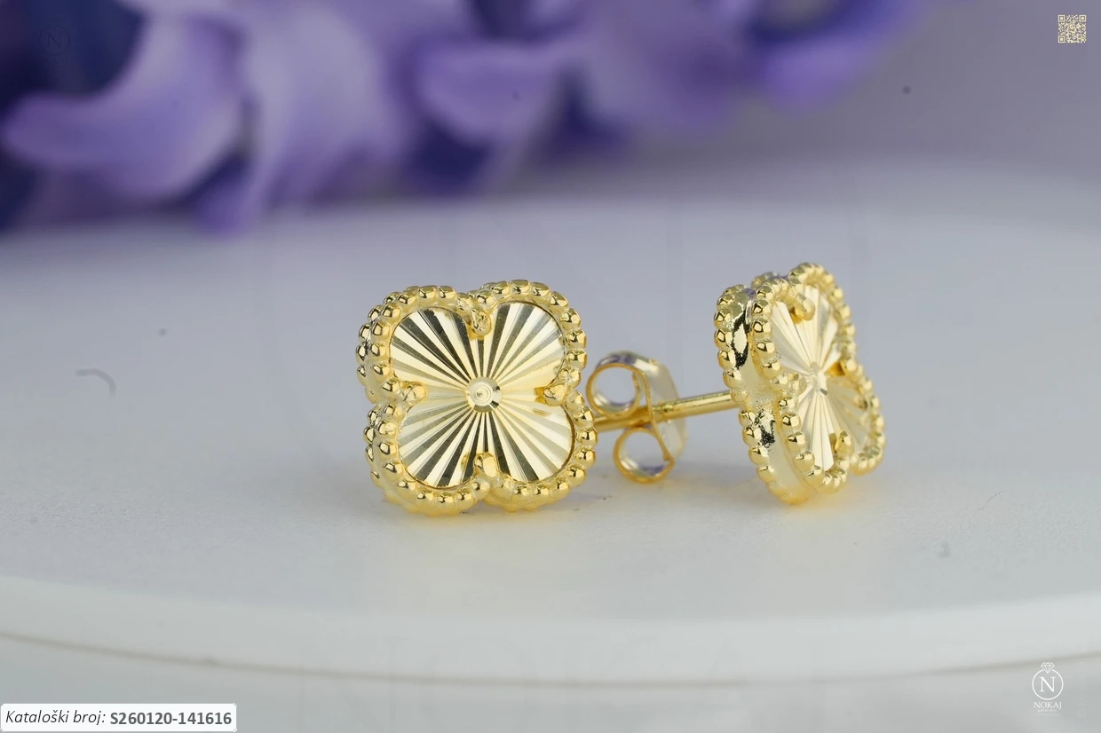 Srebrne naušnice finoće 925/1000, pozlaćene slojem 18k žutog zlata s motivom djeteline – tradicionalni simbol sreće i pozitivne energije..