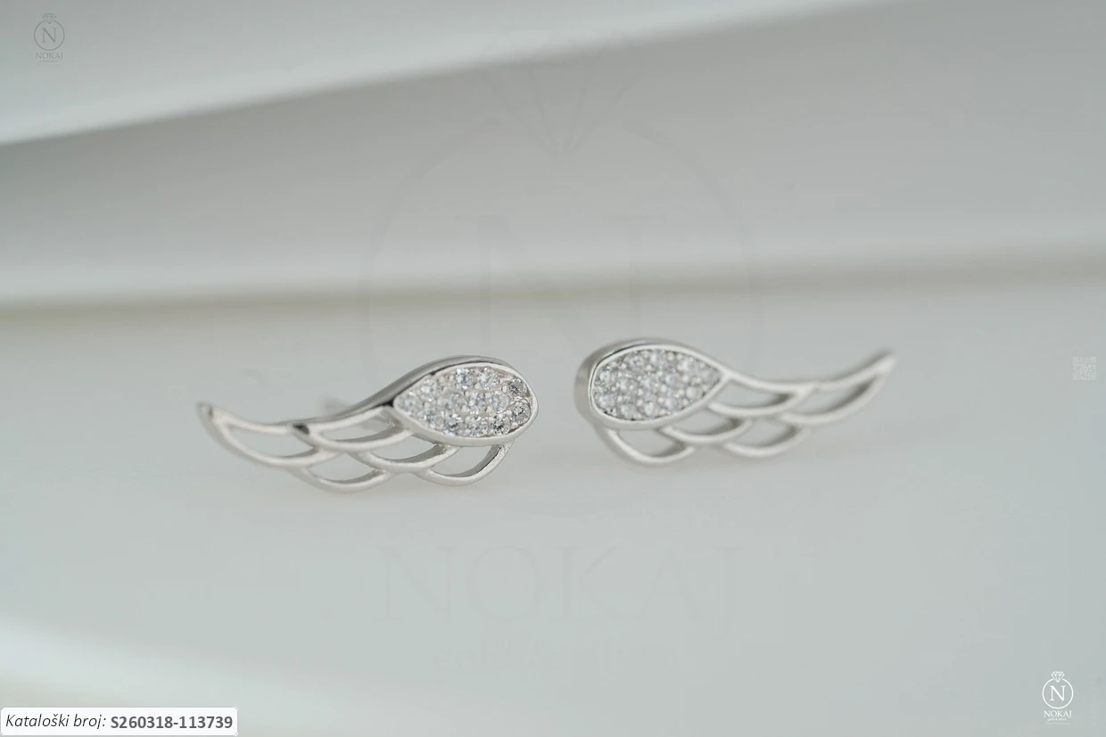 Srebrne naušnice finoće 925/1000, ukrašene cirkonima s motivom anđelovih krila – znak lagane ljepote i nebeškog čuvanja..