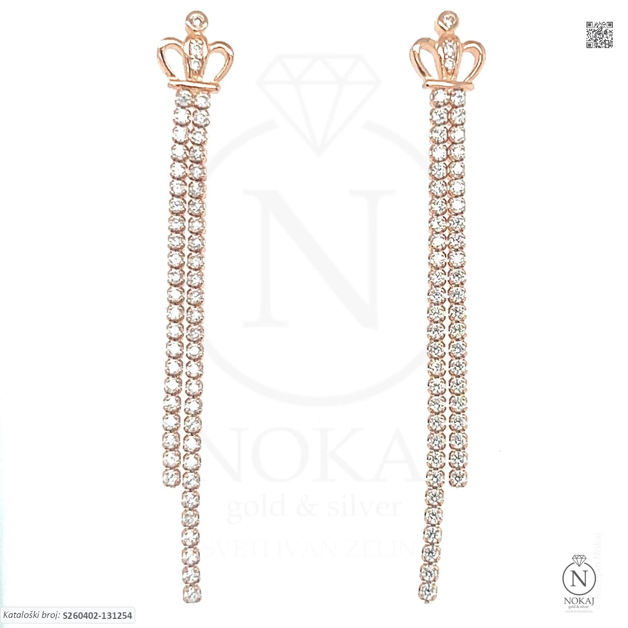 Srebrne naušnice vrhunske finoće 925/1000, pozlaćene slojem 18k ružičastog zlata, ukrašene cirkonima s motivom kruna.