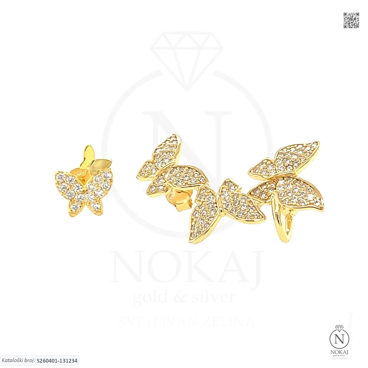 Srebrne naušnice čistoće 925/1000, pozlaćene slojem 18k žutog zlata, ukrašene cirkonima s motivom leptira.