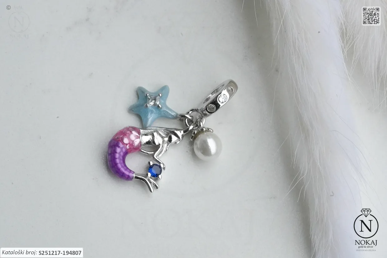 Srebrni privjesak finoće 925/1000, ukrašen cirkonima i biserom s motivima avion, morski motivi, sirena i morska zvijezda.