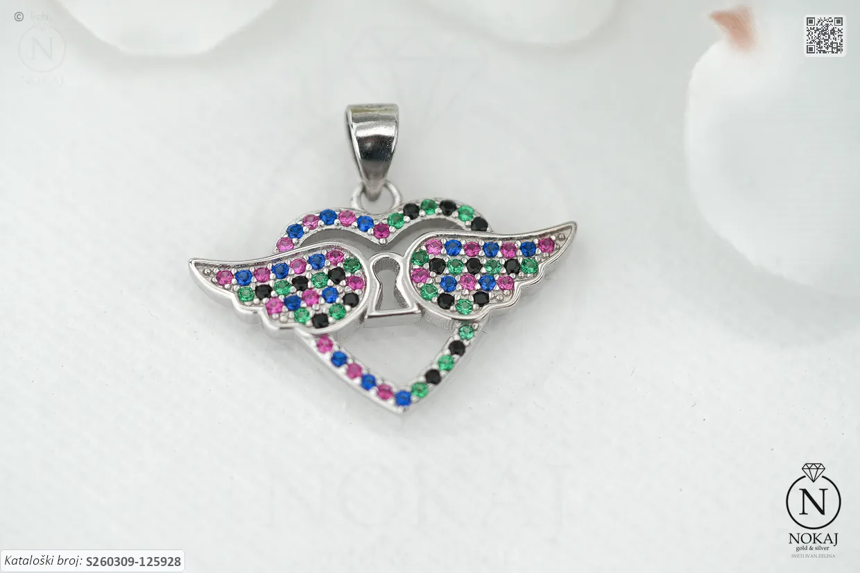 Srebrni privjesak čistoće 925/1000, ukrašen višebojnim cirkonima s motivima anđelovih krila i srca.