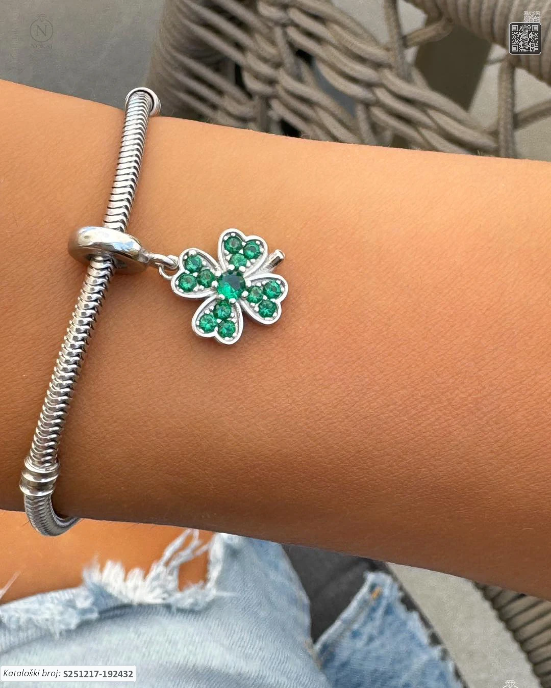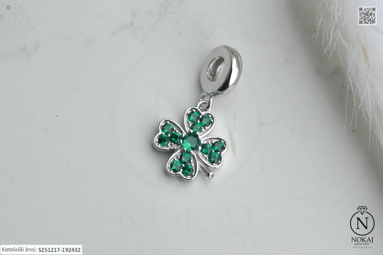 Srebrni privjesak finoće 925/1000, ukrašen zelenim cirkonima s motivom djeteline – predstavlja sreću i nove mogućnosti..