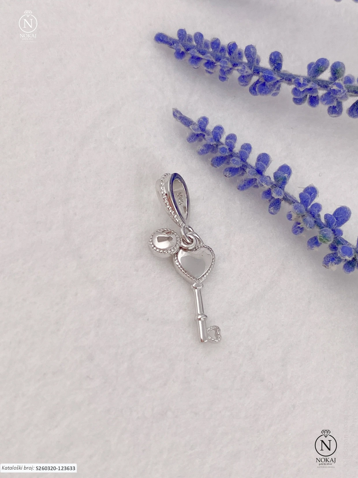 Srebrni privjesak za narukvicu finoće 925/1000, ukrašen cirkonima s motivom ključa ljubavi.
