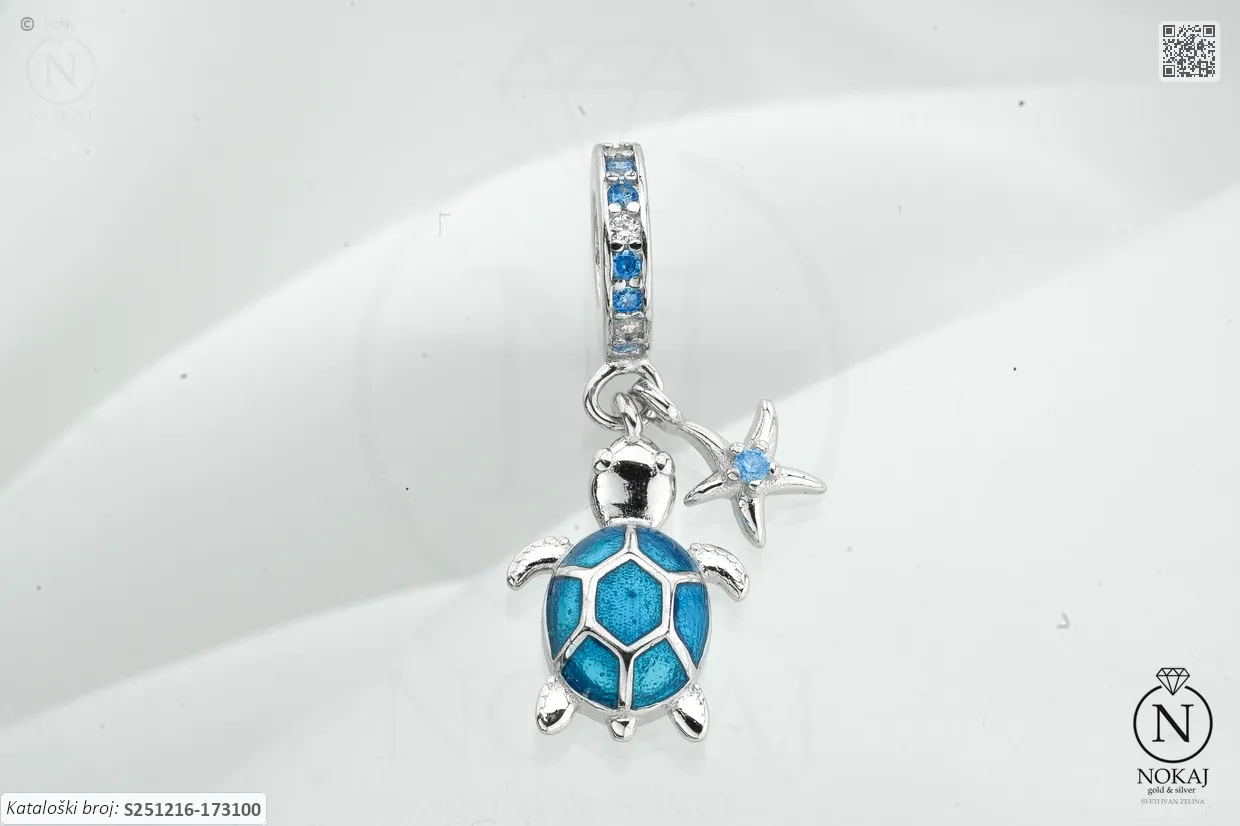 Srebrni privjesak čistoće 925/1000, ukrašen plavim cirkonima s motivom kornjače – znak postojanosti i unutarnjeg mira..
