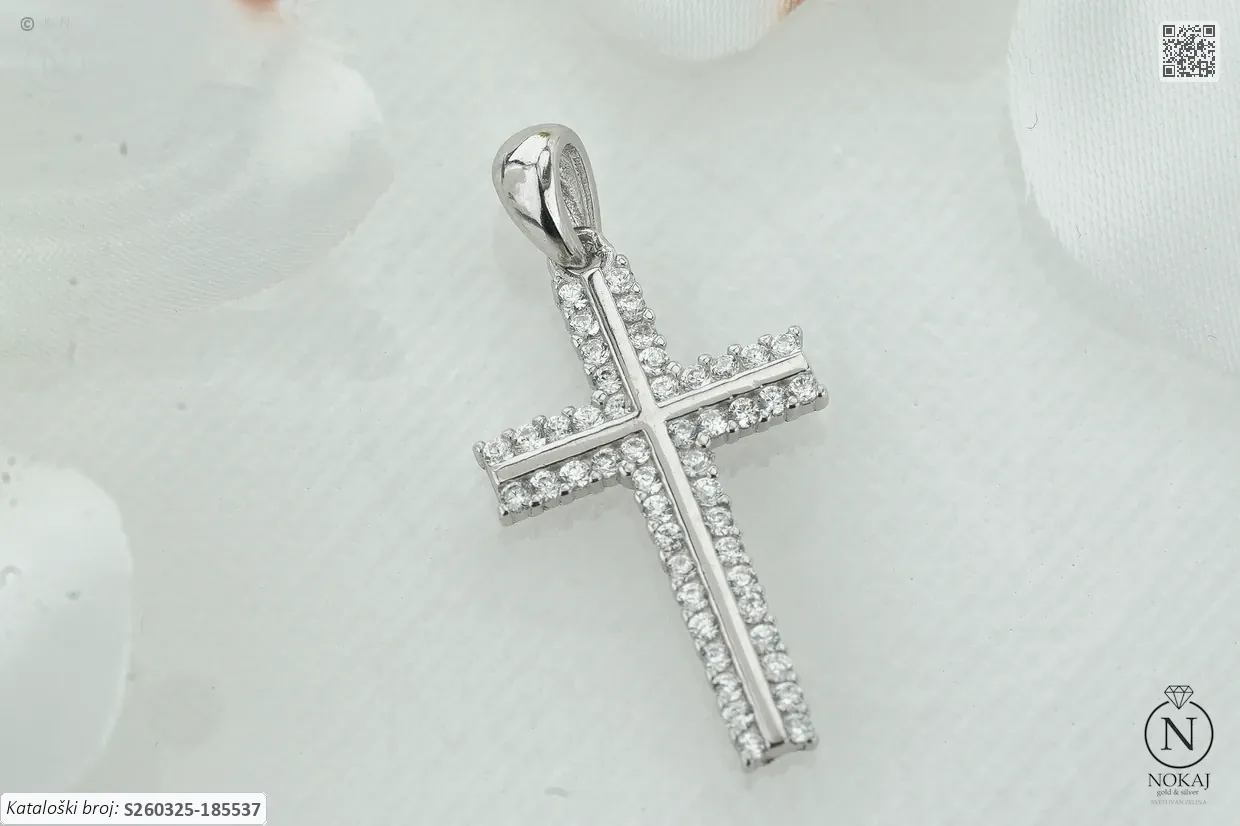 Srebrni vjerski privjesak čistoće 925/1000, ukrašen cirkonima s motivom križ – simbol ljubavi, nade i unutarnje snage..