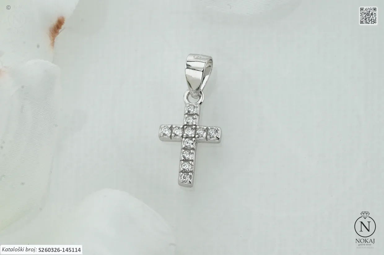 Srebrni vjerski privjesak čistoće 925/1000, ukrašen cirkonima s motivom križa – predstavlja vjeru, nadu i ljubav..