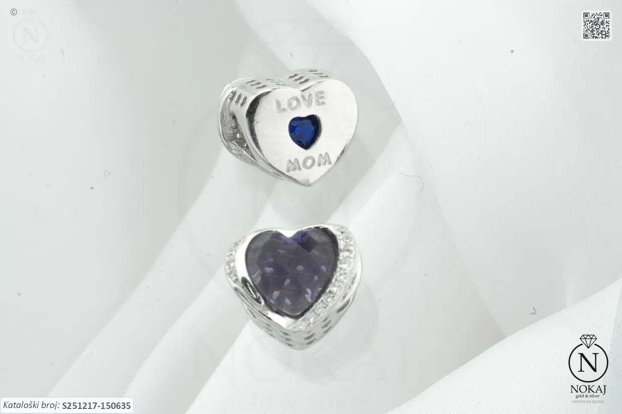 Srebrni privjesak čistoće 925/1000, ukrašen cirkonima s motivima srca i mom.