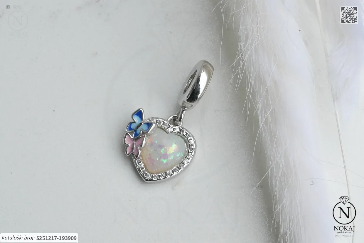 Srebrni privjesak vrhunske finoće 925/1000, ukrašen cirkonima s motivima srca i leptira.
