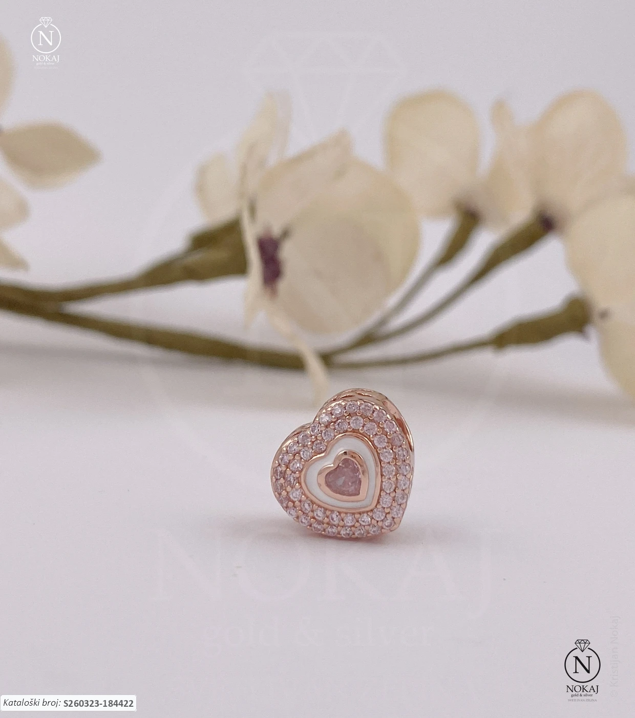 Srebrni privjesak čistoće 925/1000, pozlaćen slojem 18k ružičastog zlata, ukrašen cirkonima s motivom srca.