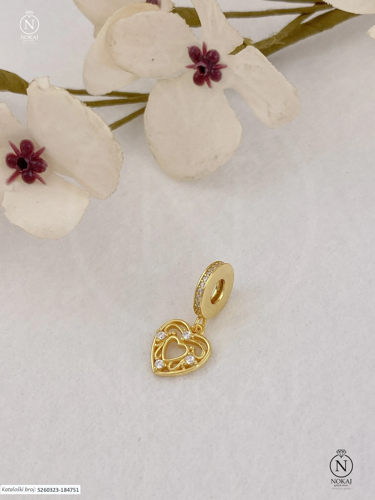Srebrni privjesak prepoznatljive finoće 925/1000, pozlaćen slojem 18k žutog zlata, ukrašen cirkonima s motivom srca.