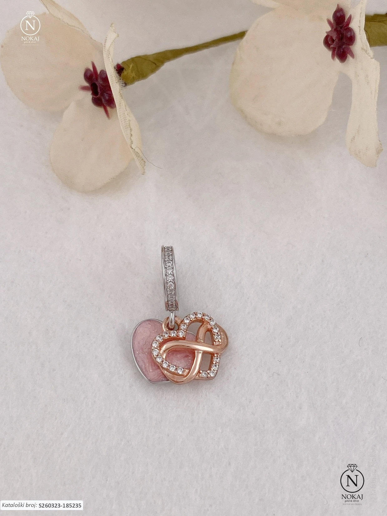 Srebrni privjesak visoke čistoće 925/1000, pozlaćen slojem 18k ružičastog zlata, ukrašen cirkonima s motivima srca i beskonačnosti.
