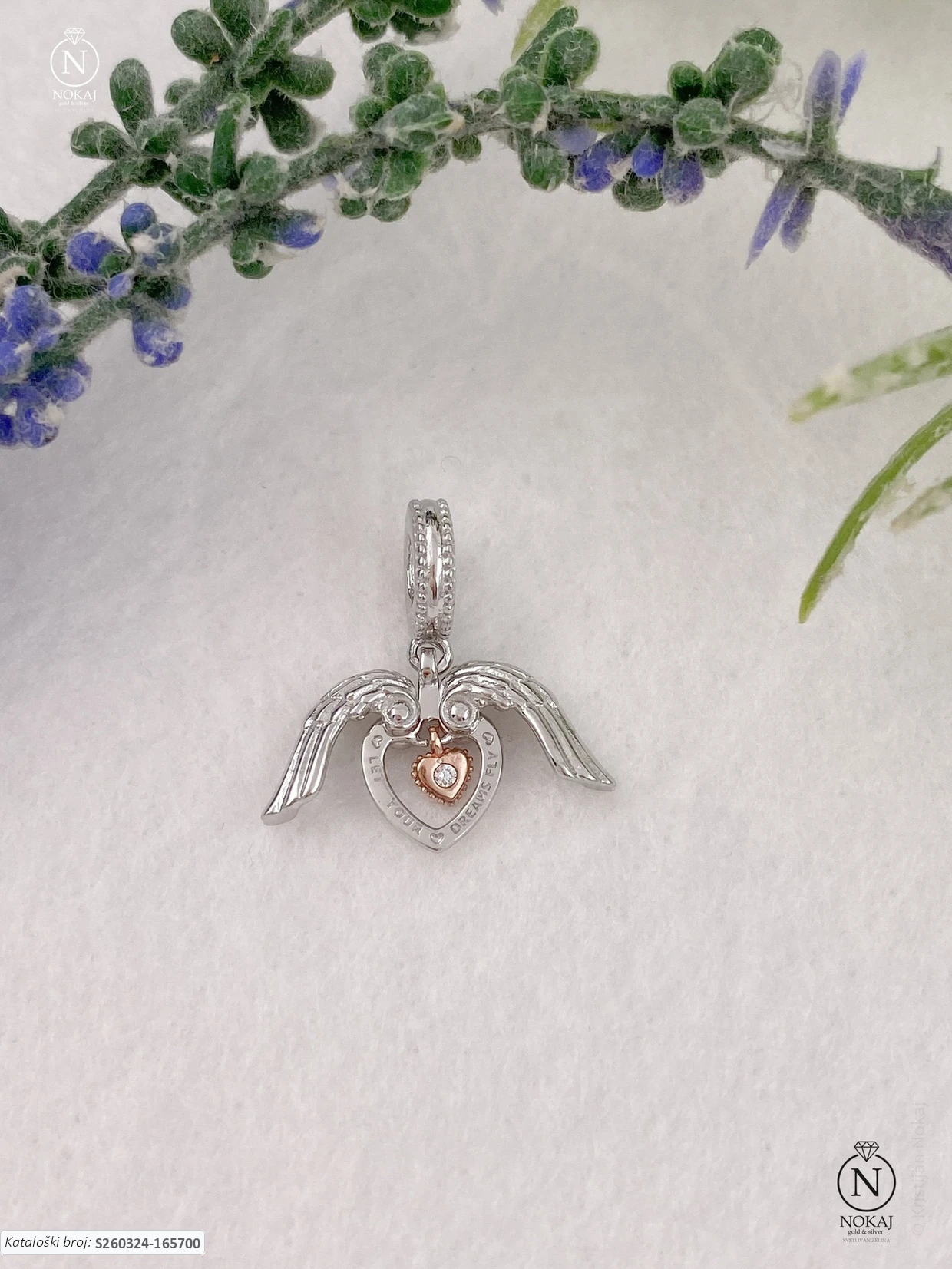 Srebrni privjesak finoće 925/1000, pozlaćen slojem 18k ružičastog zlata, ukrašen cirkonima s motivima srca i anđelovih krila.