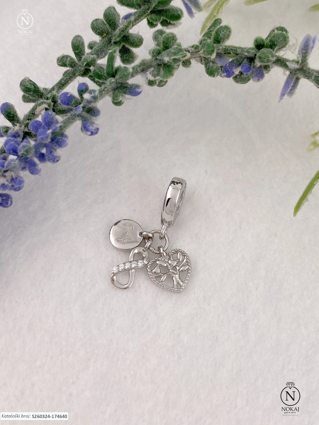 Srebrni privjesak visoke čistoće 925/1000, ukrašen cirkonima s motivima srca, stabla života i beskonačnosti.