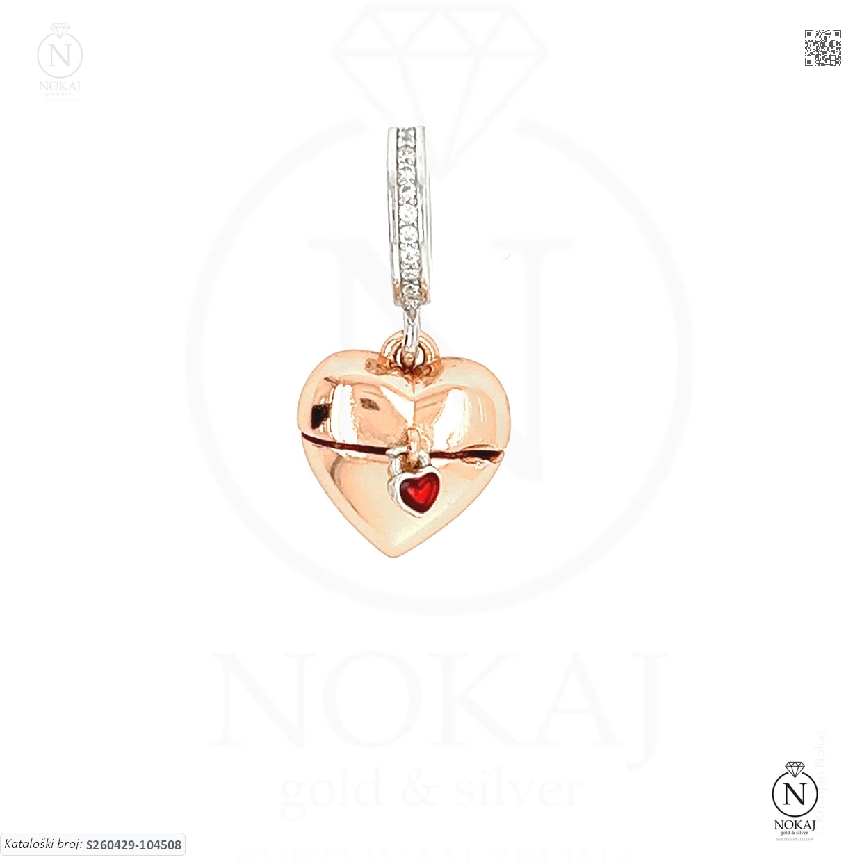 Srebrni privjesak finoće 925/1000, pozlaćen slojem 18k ružičastog zlata, ukrašen cirkonima s motivom srca – predstavlja ljubav, toplinu i iskrenost..