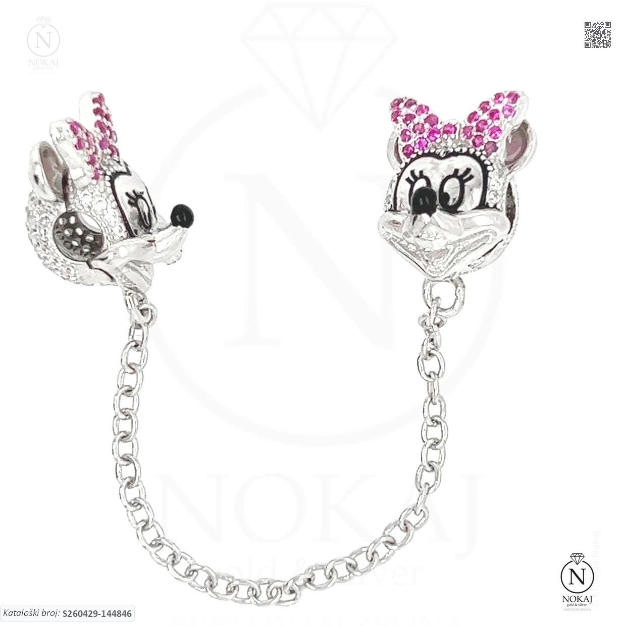Srebrni privjesak vrhunske finoće 925/1000, ukrašen cirkonima s motivom stiliziranog crtićnog obilježja.