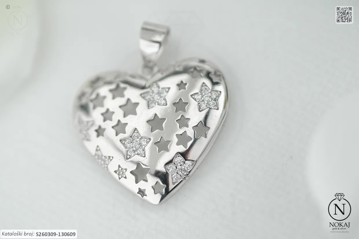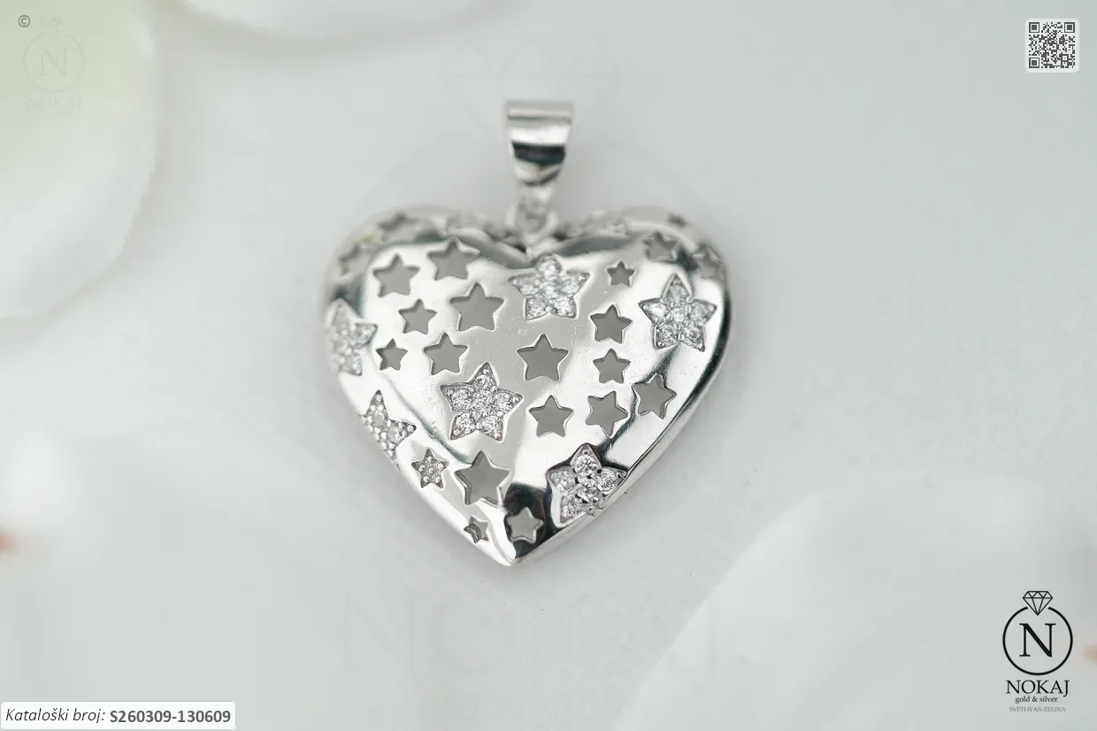 Srebrni privjesak čistoće 925/1000, ukrašen cirkonima s motivima zvijezde i srca.