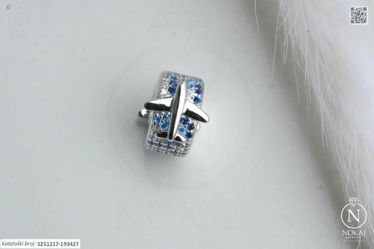 Srebrni privjesak čistoće 925/1000, ukrašen plavim cirkonom s motivom avion.