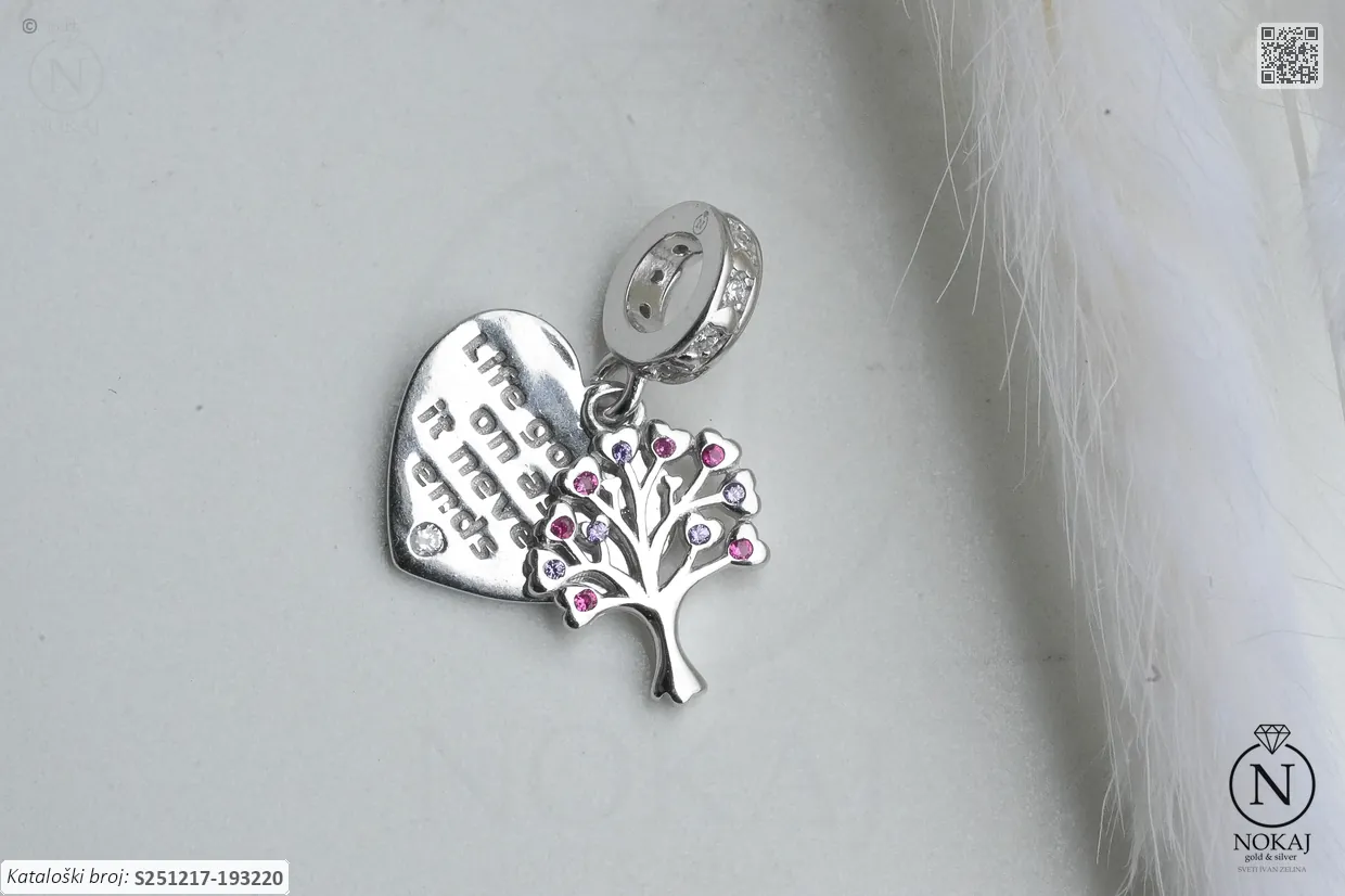 Srebrni privjesak finoće 925/1000 s motivima stabla života i srca.