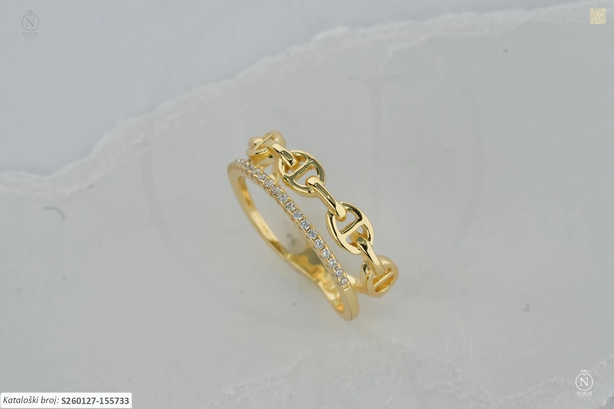 Srebrni prsten finoće 925/1000, pozlaćen slojem 18k žutog zlata, ukrašen cirkonima.