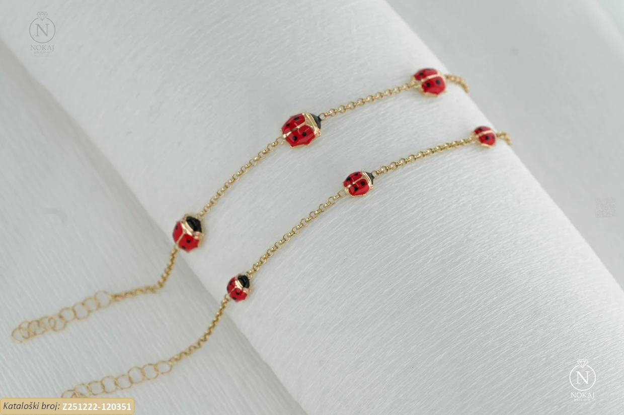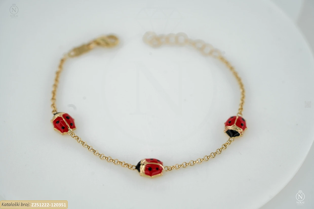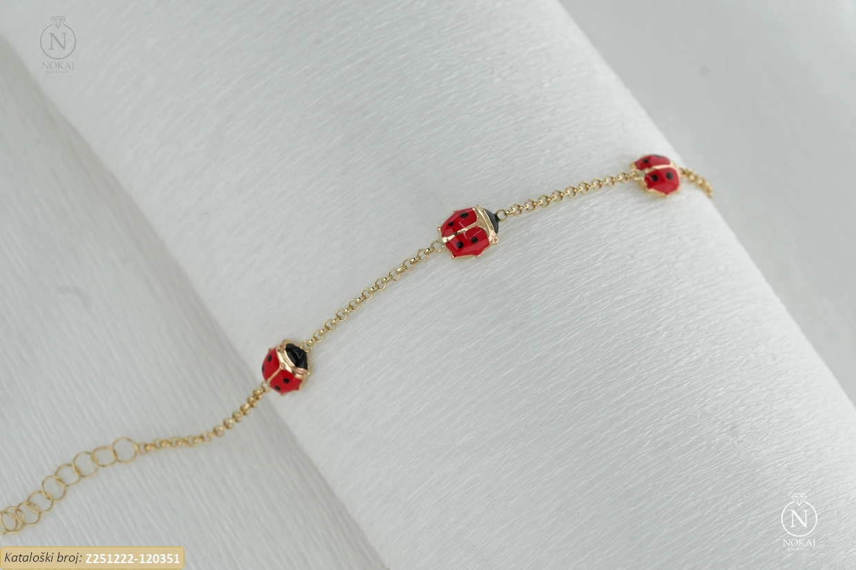 Dječji nakit – siguran i nježan dizajn savršen za najmlađe.: zlatna dječja narukvica izrađena izrađen od 14k žutog i bijelog zlata – čistoća 585/1000 ukrašena bezom s motivom bubamare.