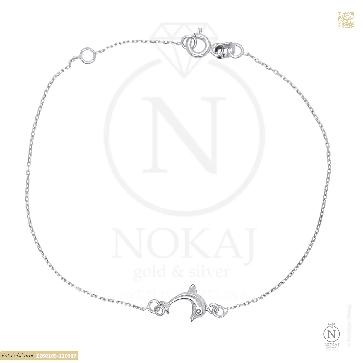 Zlatna narukvica izrađena izrađen od 14k bijelog zlata – čistoća 585/1000 s motivom dupina.