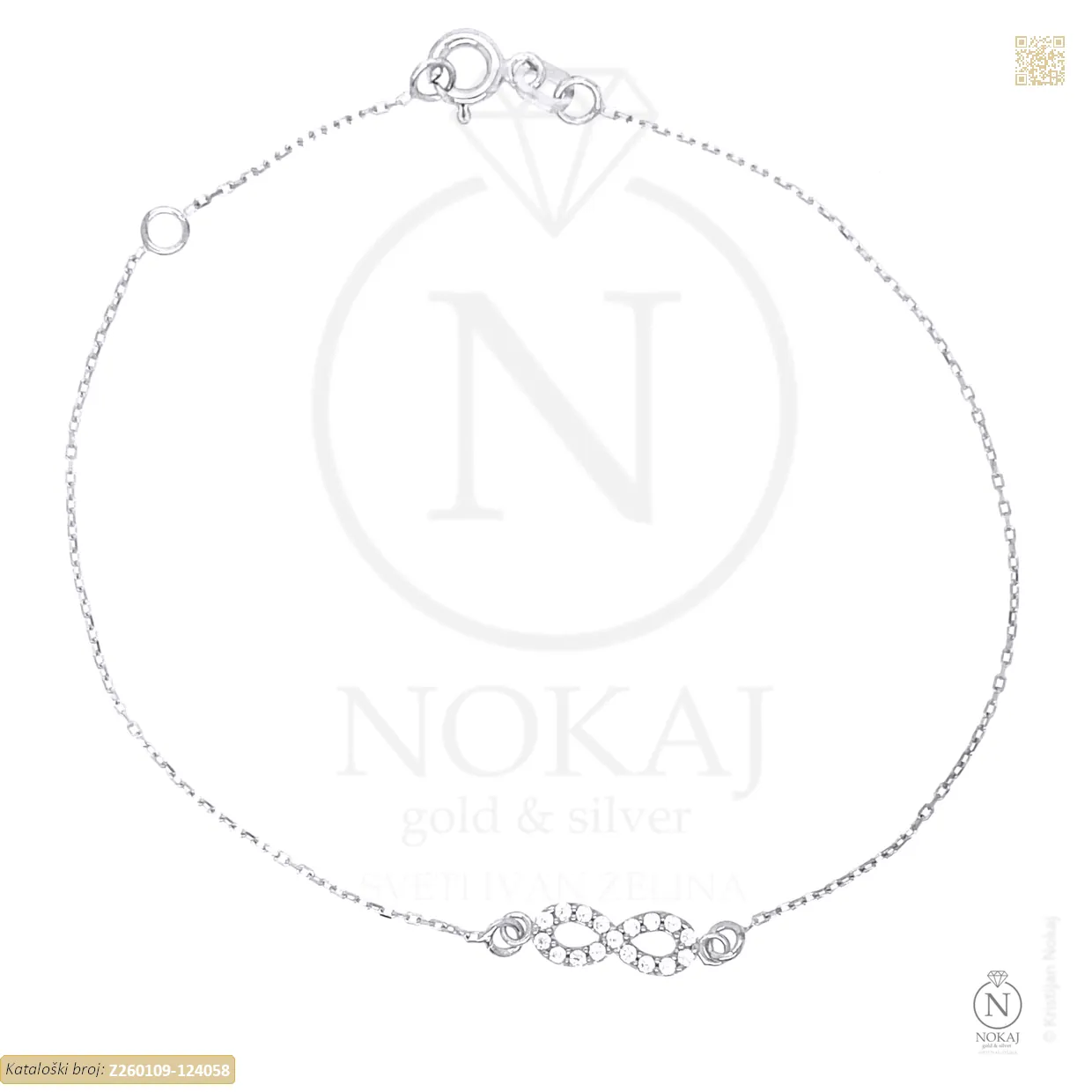Zlatna narukvica izrađena iz 14-karatnog bijelog zlata (585/1000) ukrašena cirkonima s motivom beskonačnosti.