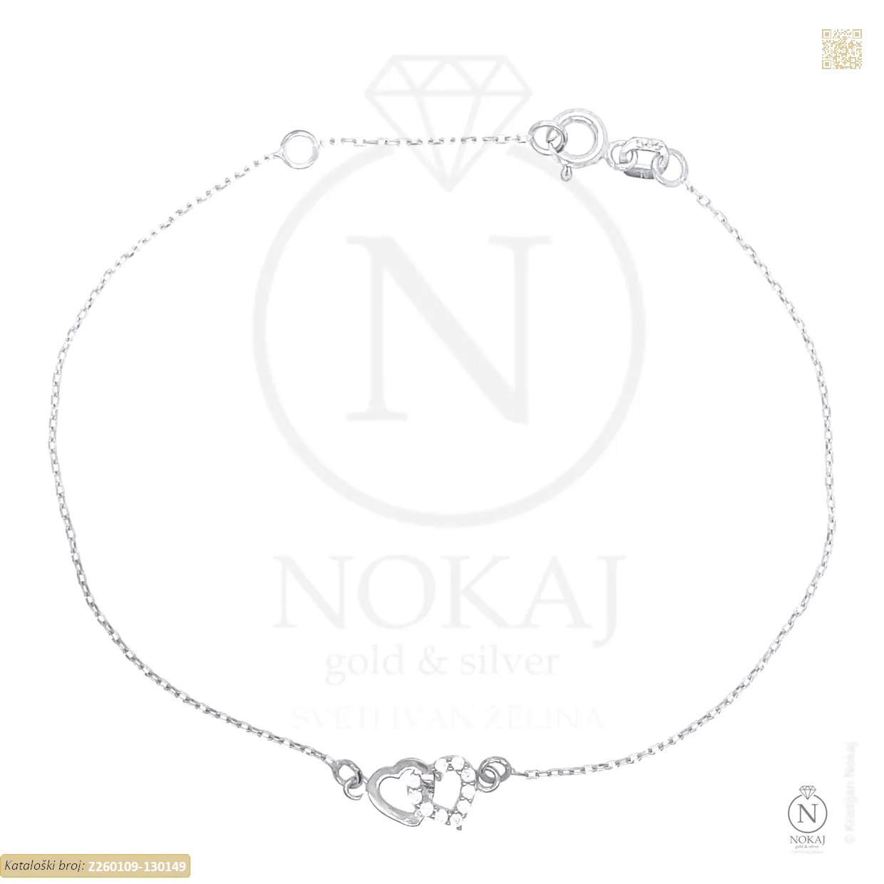 Zlatna narukvica izrađena izrađen od 14k bijelog zlata – čistoća 585/1000 ukrašena cirkonima s motivom srca.