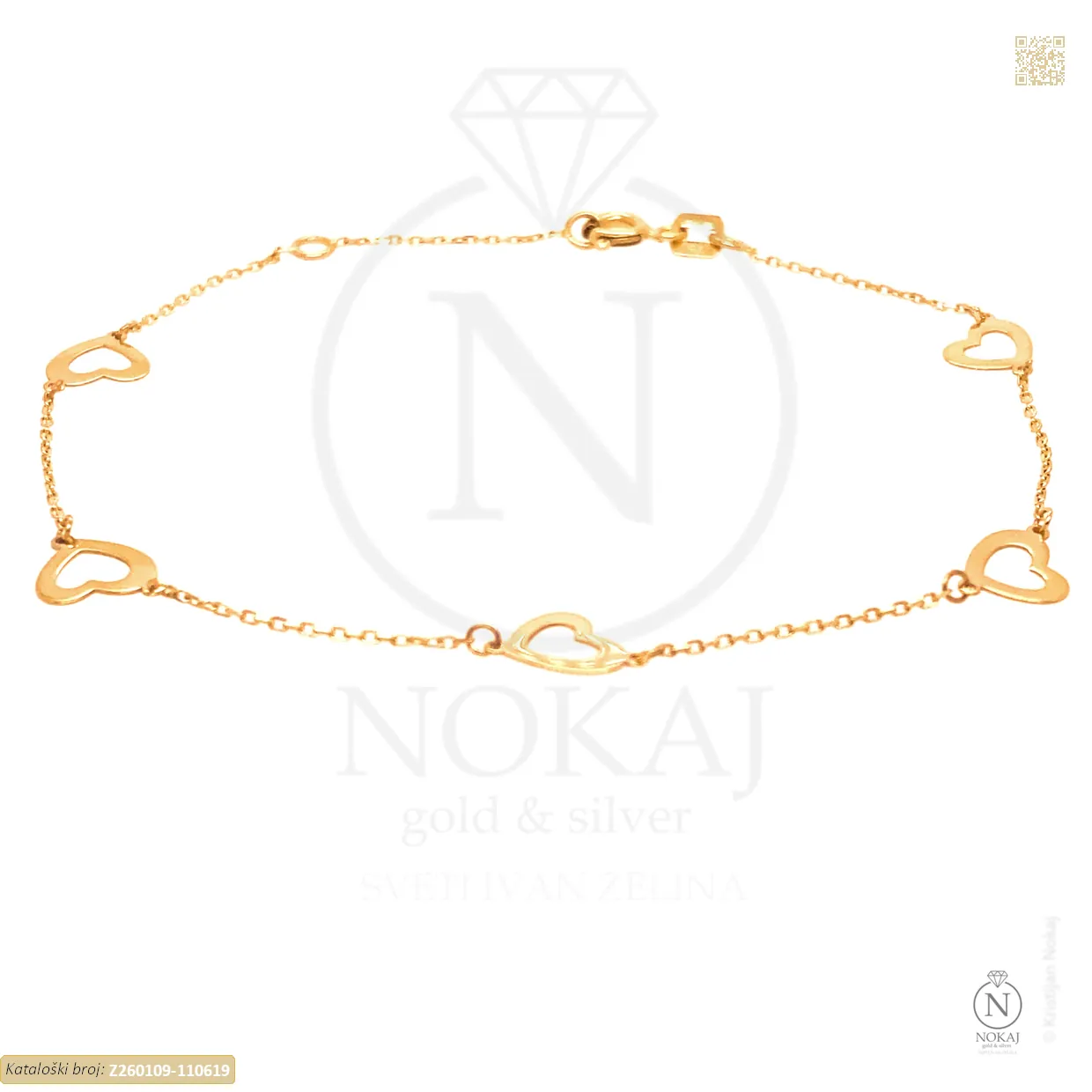 Zlatna narukvica izrađena izrađen od 14k žutog zlata – čistoća 585/1000 s motivom srca.