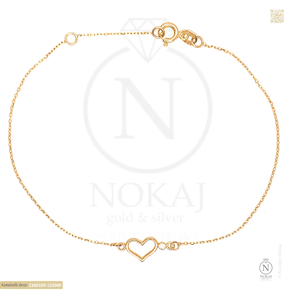 Zlatna narukvica izrađena od 14-karatnog žutog zlata čistoće 585/1000 s motivom srca.