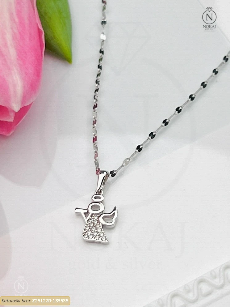 Zlatni vjerski lančić izrađen od 14-karatnog bijelog zlata čistoće 585/1000 s motivom anđeo – simbol dobrote i zaštite..